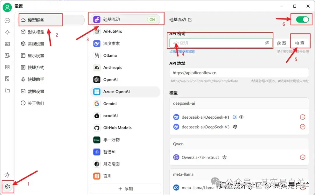 打开Cherry Studio【设置 - 模型服务】填写硅基流动的API密钥即可使用