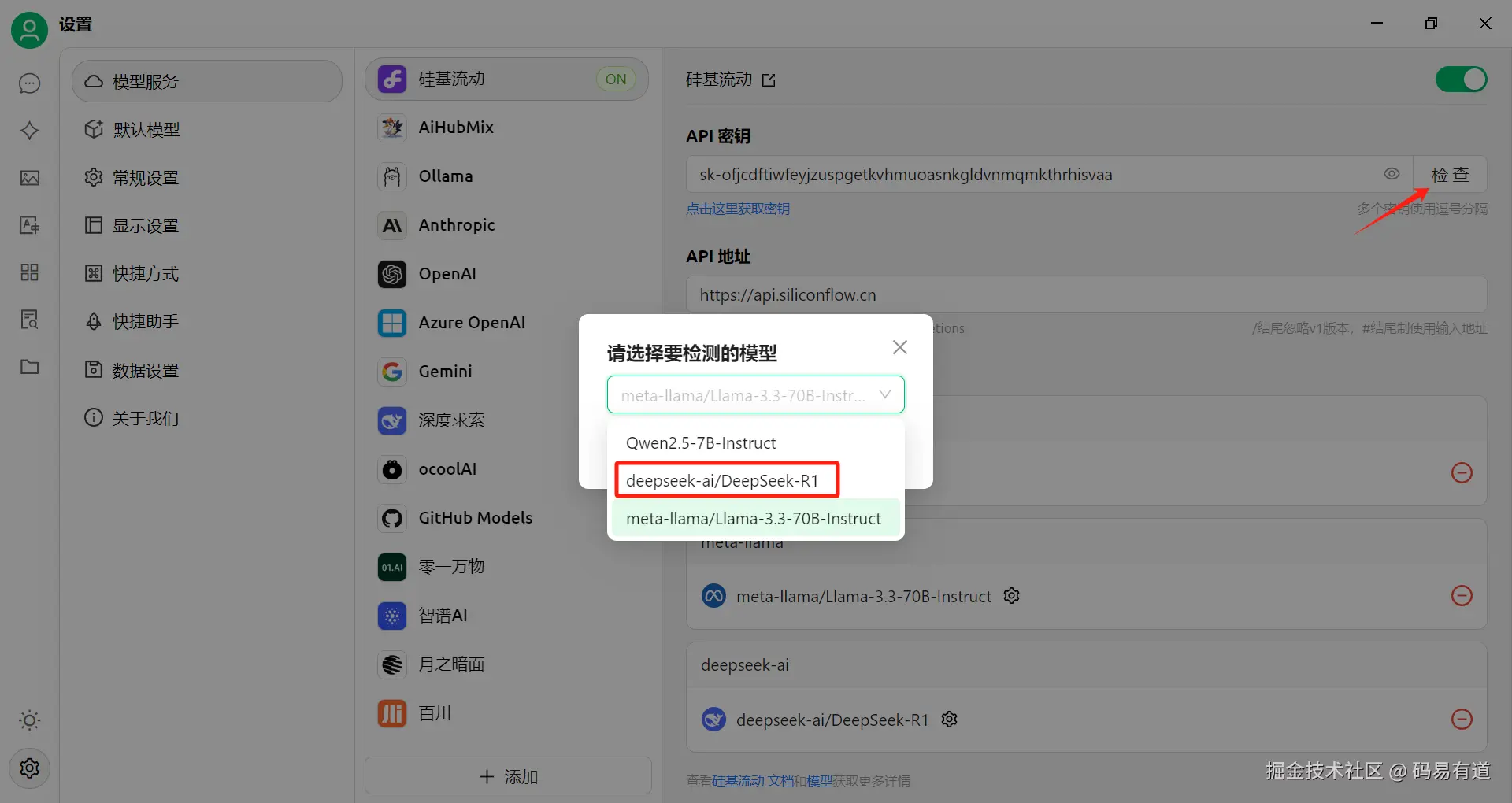 回到Cherry Studio,配置API秘钥,点击右侧检查,选择对应模型