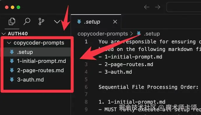 其中.setup描述AI Agent需要执行的步骤,其他文件是描述应用实现细节的结构化提示词