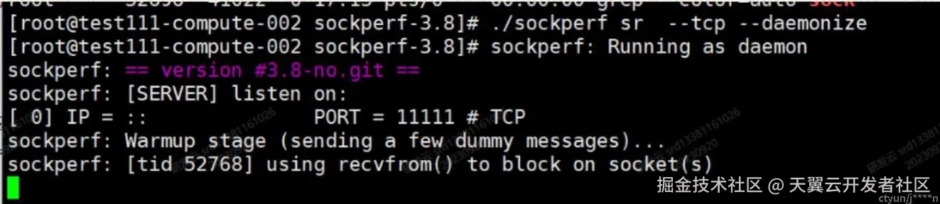 - 在测试机执行以下命令,启动服务 ./sockperf sr --tcp --daemonize