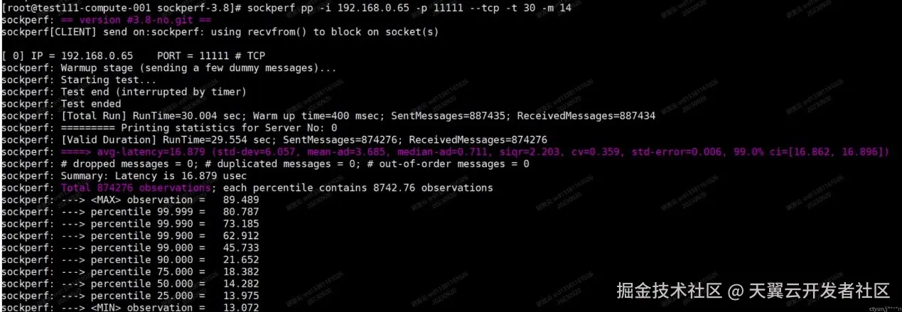 - 在辅助机上执行以下命令,向测试机输入流量 sockperf pp -i 192.168.0.65 -p 11111 --tcp -t 300 -m 14