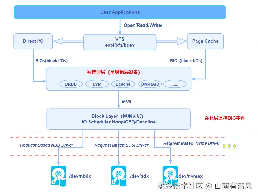 对于Linux 磁盘IO流程,所有的块IO都需要经过通用块层(Block Layer)处理,这一层主要实现BIO调度逻辑,比如将一个大BIO请求拆分为多个小的BIO请求,将相邻的BIO请求合并,实现各种BIO调度等。增量的数据同步不,需要动态监测落盘完成的增量BIO,并将增量同步到目标端磁盘。