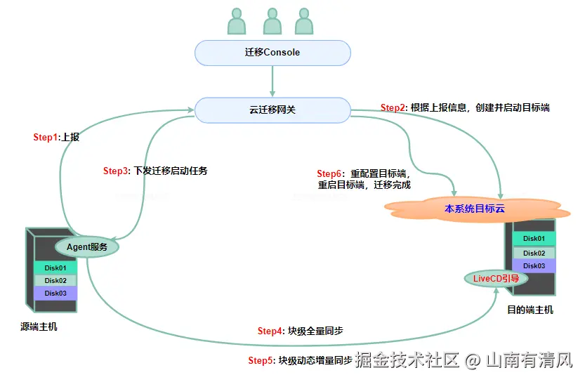 如下,主机迁移服务工作原理如下图,主要步骤如下所述: