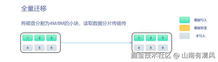 需要说明的是,进行全量数据拷贝前,会开启对所有源端磁盘的写 IO 事件监控。这部分属于 Agent 拿到全量迁移指令后,自动开启的动作,用户无需操作。