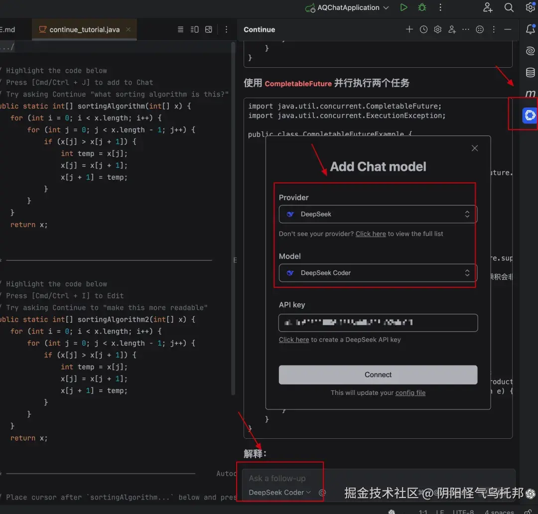 IDEA 右侧便可以看到 Continue 的图标,选择添加 DeepSeek 模型和 DeepSeek Coder,再填写 DeepSeek API Key。