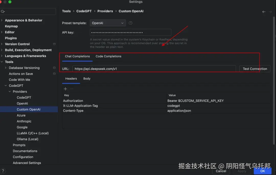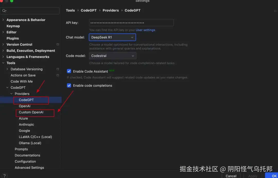 点击 Providers 并选择 Custom OpenAI 或者 CodeGPT 并选择对应的模型并配置 API Key 即可。