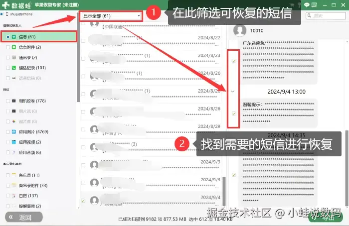步骤2:在扫描结果中,选择 【信息】 类别,找到并勾选需要恢复的短信。点击 【恢复】 ,选择保存路径,完成恢复。