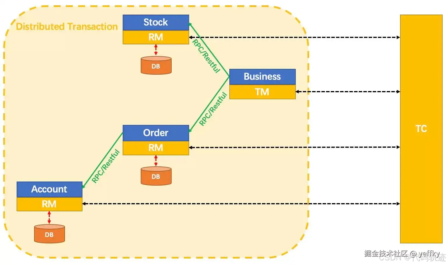 - XID:全局事务的唯一标识,在微服务调用链中传递,绑定到服务的事务的上下文。
