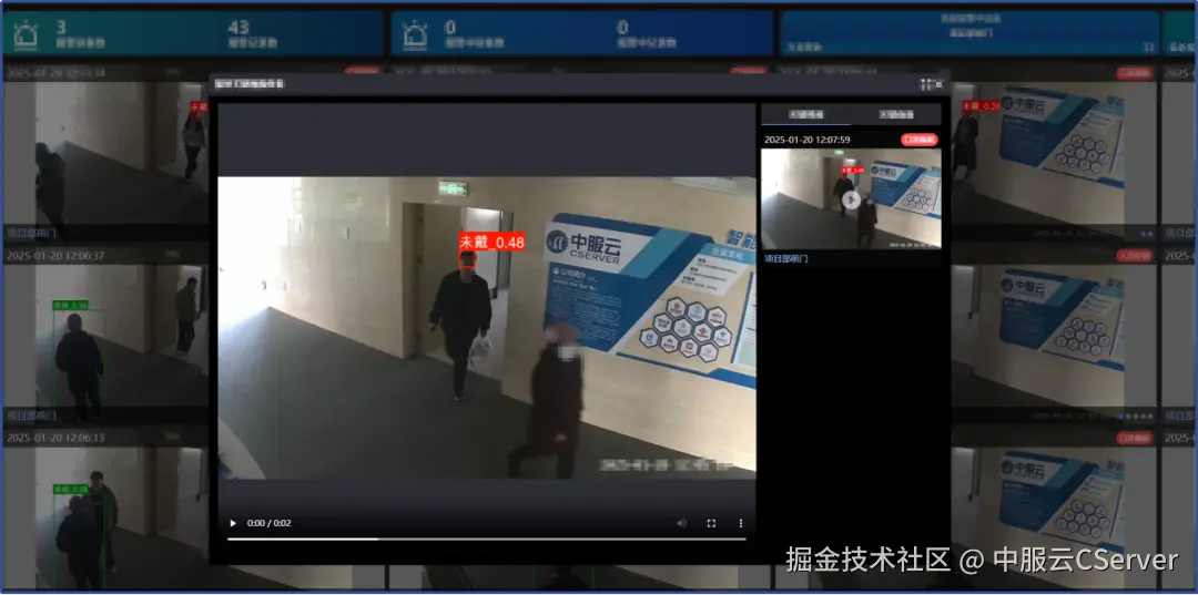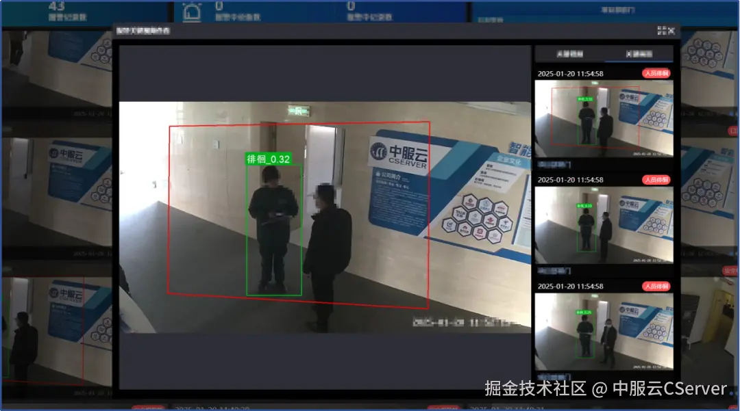 按照给视频摄像头配置的AI算法,红框实时显示视频事件位置。
