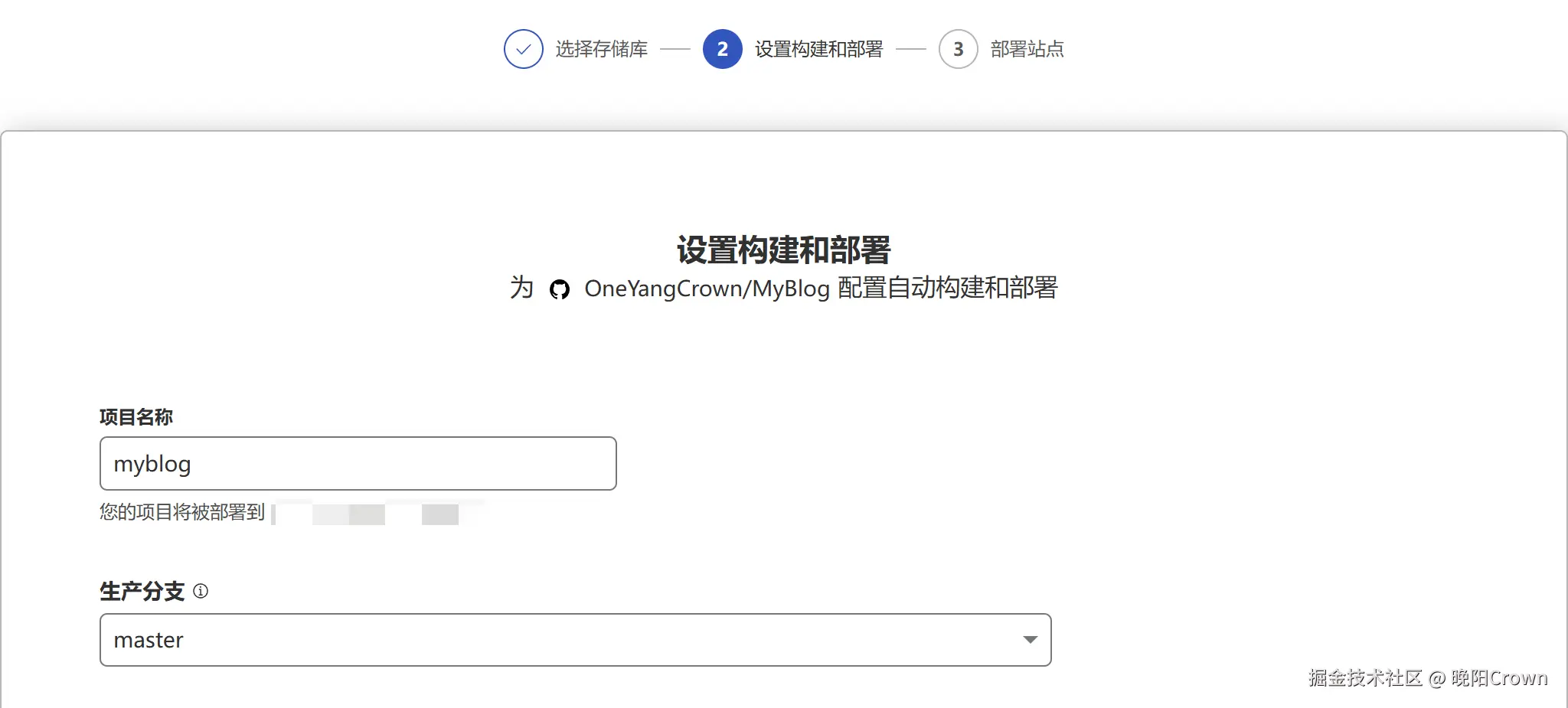 自定义一个项目名称,生产分支选择前面hexo站点配置中设置的部署分支