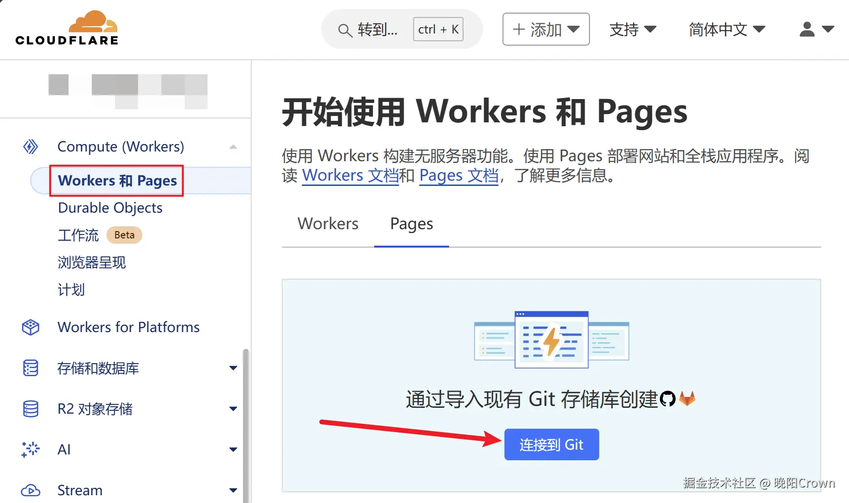 进入cloudflare后台的 Workers和Pages 设置页面,点击连接到Git