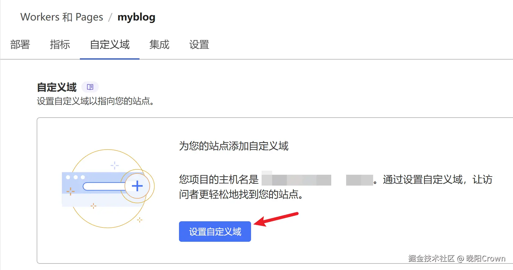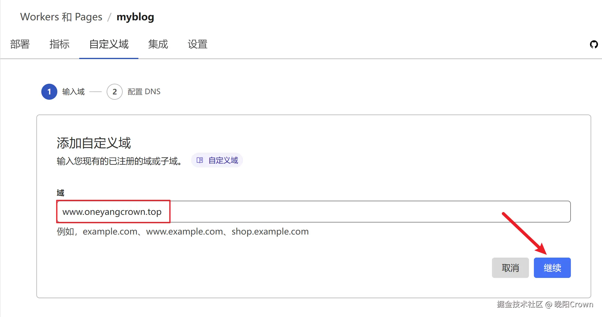 打开Cloudflare Pages项目设置页面,设置你的博客访问网址,点击继续