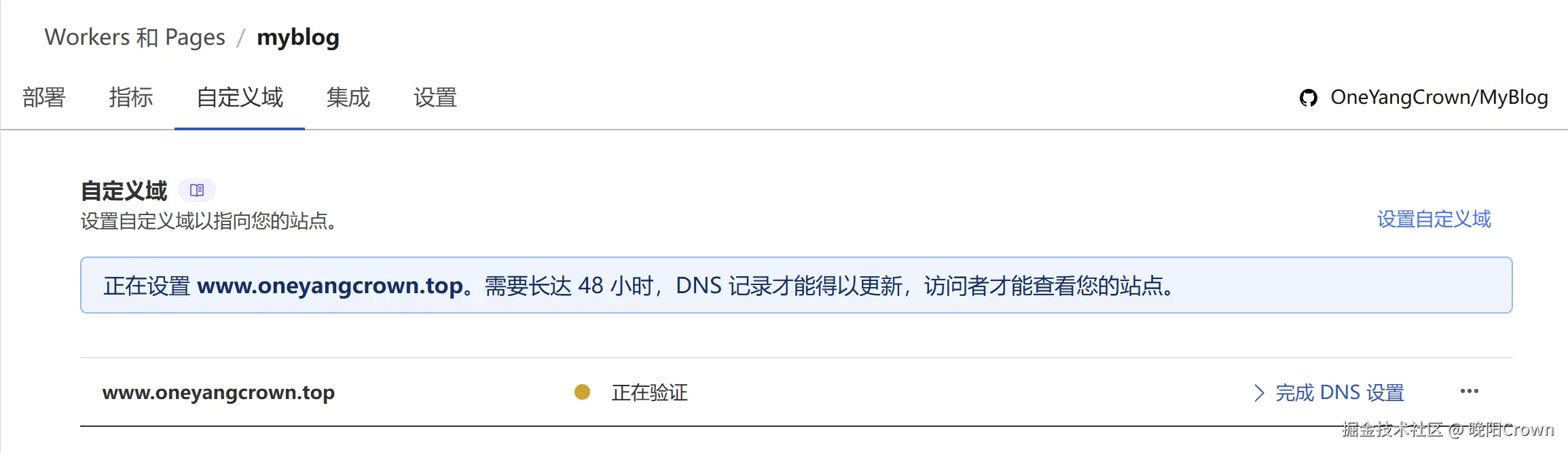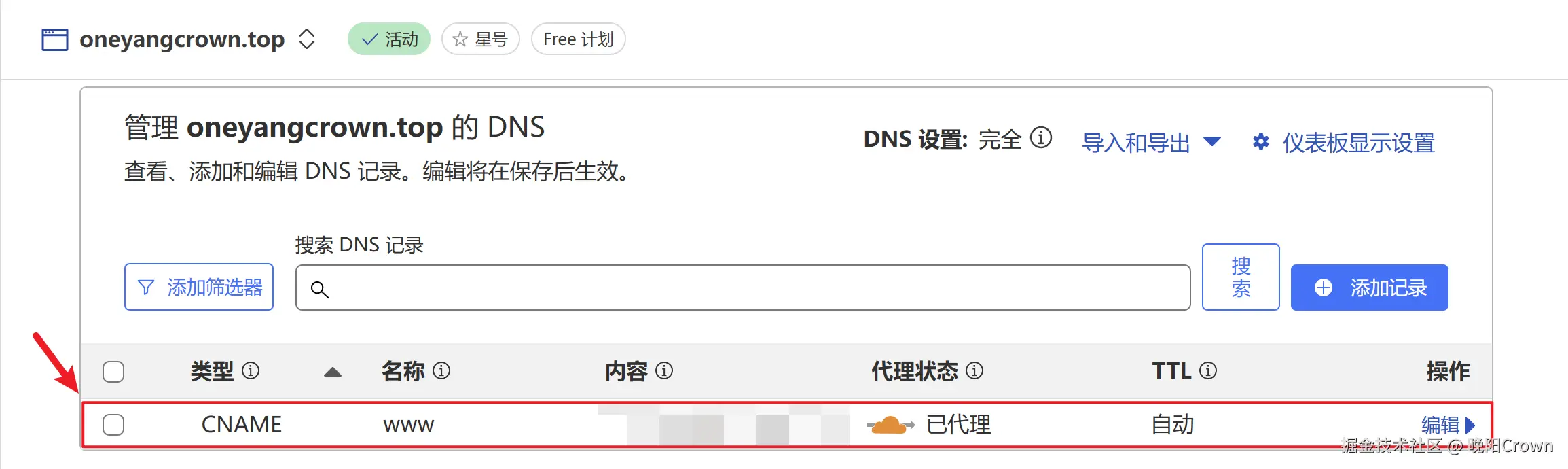 我购买的这个域名oneyangcrown.top也是托管在Cloudflare,所以可以在Cloudflare的域名管理页面查看到自动添加的CNAME记录