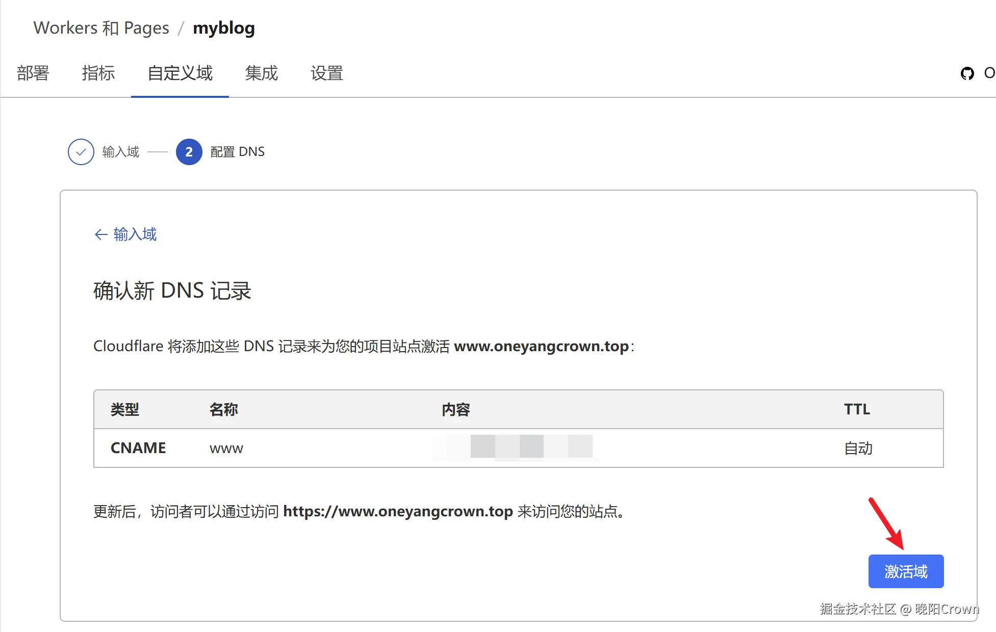 Cloudflare会自动添加一条CNAME记录,点击激活域
