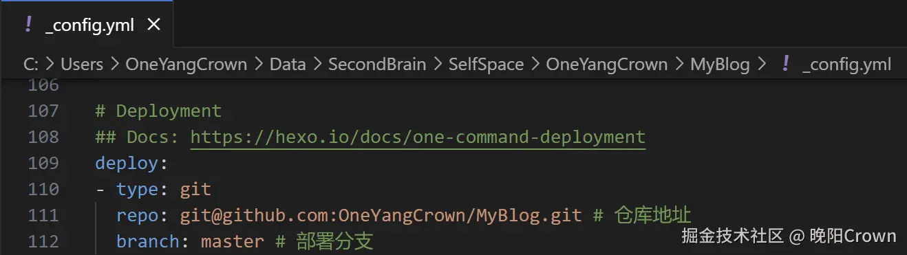 在hexo站点配置文件中设置好部署配置