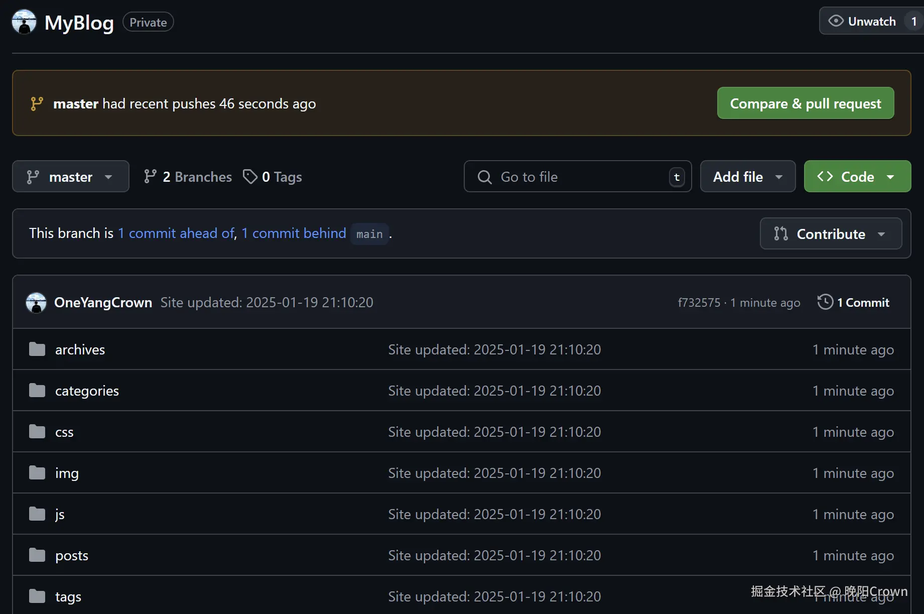 hexo执行部署完成后,在Github仓库中切换到你设置hexo部署分支(上面我设置的是master分支),就可以看到推送过来的网页文件了