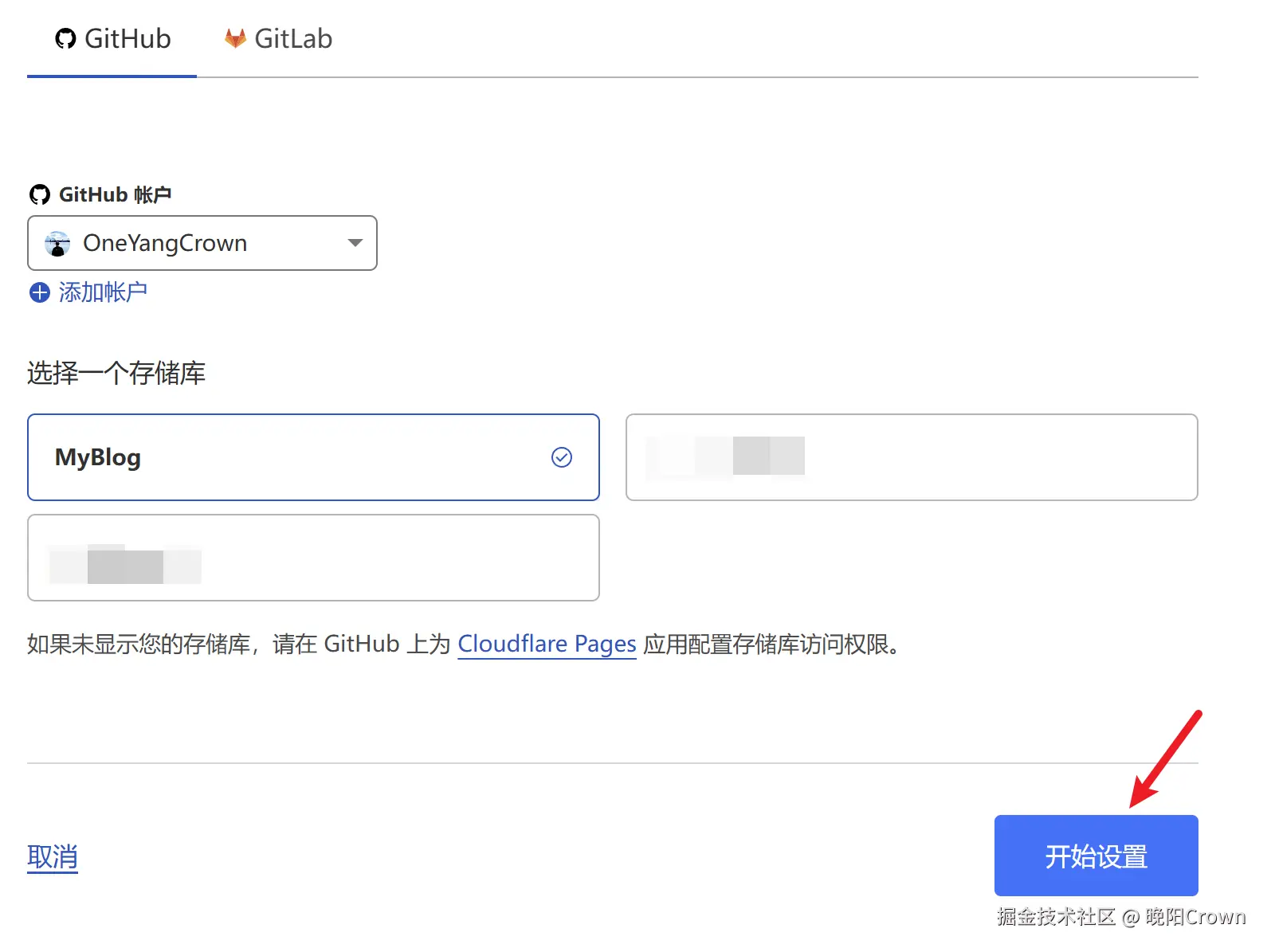 连接你的Github账户,选择前面创建的博客部署仓库,点击开始设置