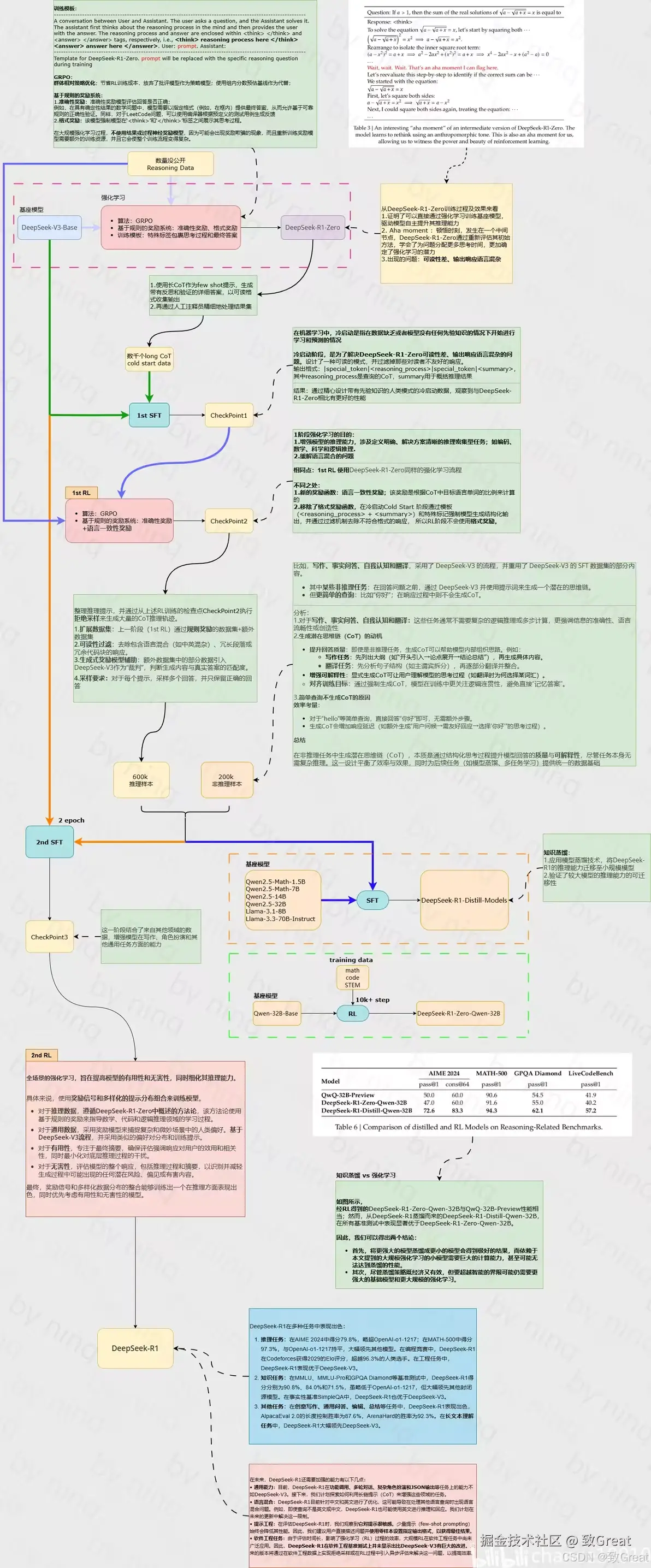 - 通过引入冷启动数据和多阶段训练流程,提升模型的可读性和语言混合问题。