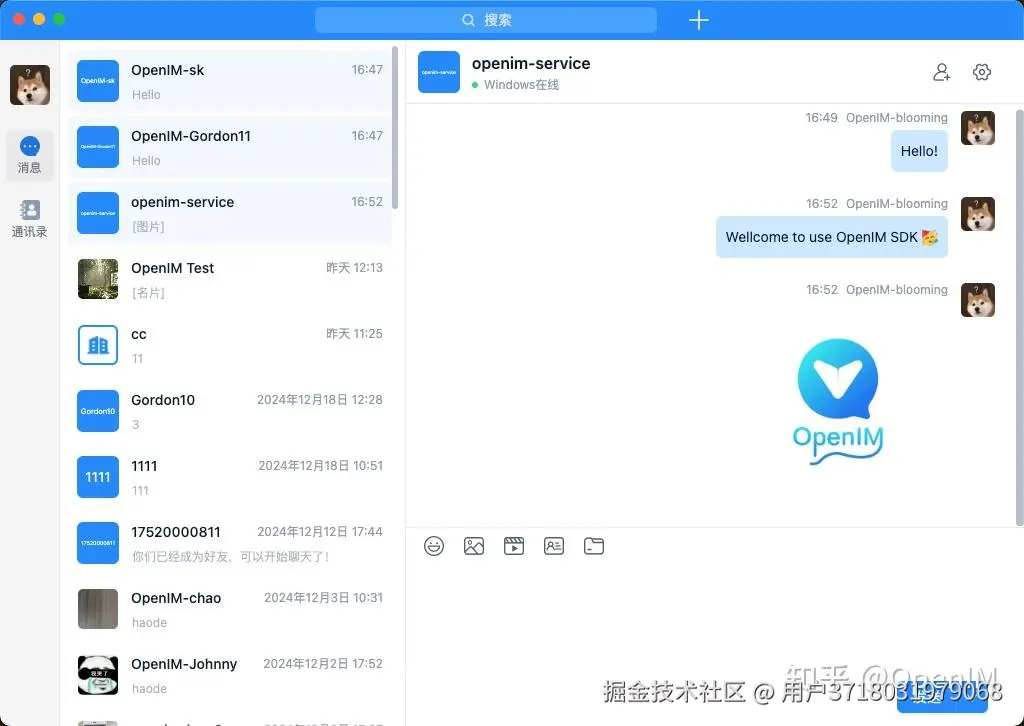 提供开源即时通讯 SDK,作为 Twilio、Sendbird 等云服务的替代方案。借助 OpenIM,开发者可以构建安全可靠的即时通讯应用,如 WeChat、Zoom、Slack 等。