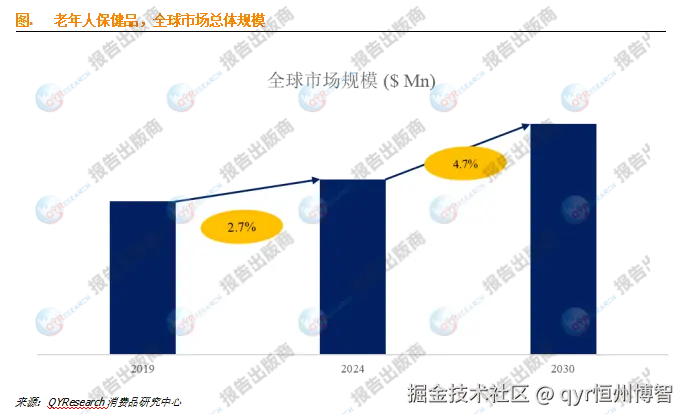 据QYResearch调研团队最新报告“全球老年保健品市场报告2024-2030”显示,预计2030年全球老年保健品市场规模将达到1631.1亿美元,未来几年年复合增长率CAGR为4.7%。