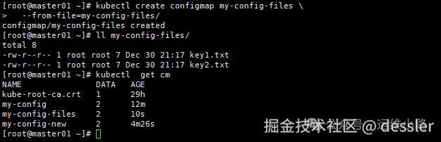 假设有一个名为my-config-files的目录,其中包含名为key1.txt和key2.txt的两个文件,内容分别为value1和value2。可以使用以下命令将这个目录加载为一个ConfigMap: