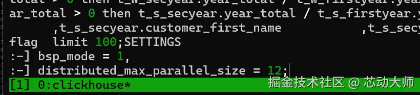 其中参数distributed_max_parallel_size可以设置为 4 的其他整数倍(因为 Worker 的数量为4)。注意要把limit 100后的分号去掉。