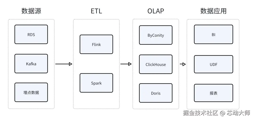 传统的 OLAP 产品通过数据索引、列式存储、向量化执行等技术,注重对实时分析或者 Ad-hoc 分析的快速反应,满足低时延的要求。在数据加载进 OLAP 产品之前,往往需要经过复杂的数据清洗和转换过程,也就是大家熟知的 ETL 任务。在传统的数据分析架构中,这部分工作是由 Hive、Spark、Flink 等产品来完成的。