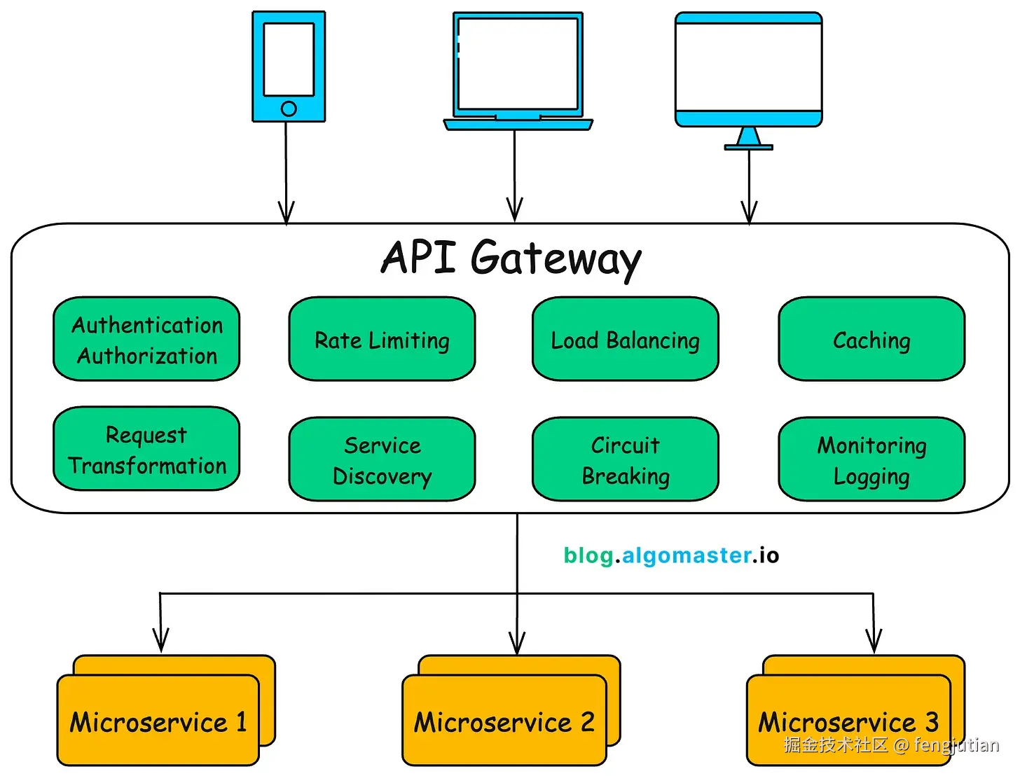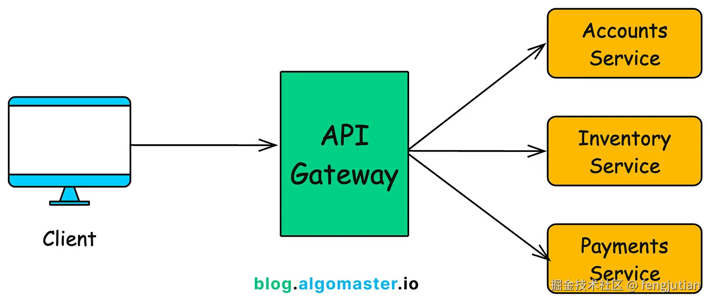 客户端不再直接与多个微服务交互,而是将请求发送到 API 网关。网关处理这些请求,执行安全策略,并将它们转发到相应的微服务。