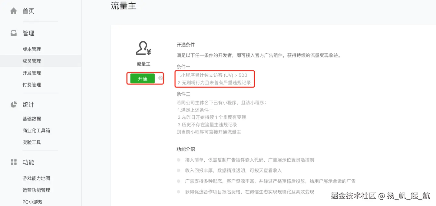 微信小程序平台功能->流量主点击开通按钮即可,当用户数量未满足时,开通按钮为灰色。