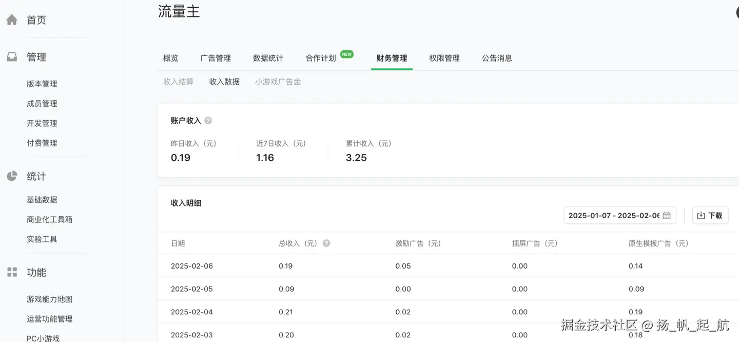 开通流量主接入广告之后,我们可以查看每天的收益情况。