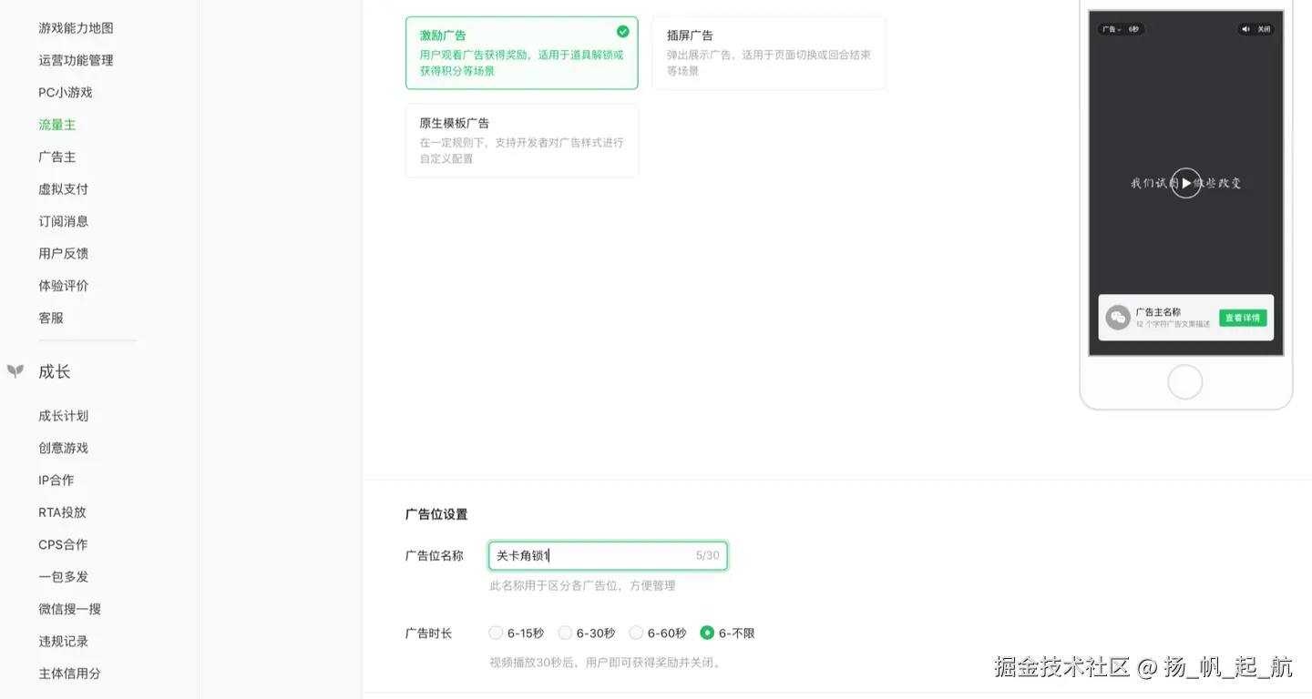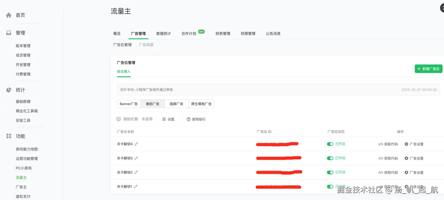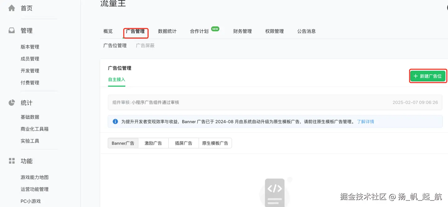 - 流量主开通之后,我们可以在广告管理中点击新建广告位进行多种类型的广告的创建