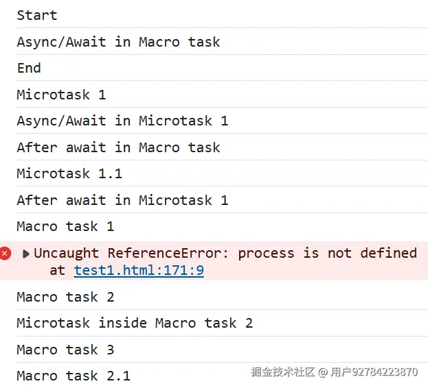 输出结果:---->Start / End / Macro task 1 / End of Macro task 1 / Microtask inside Macro task 1 / Macro task 2