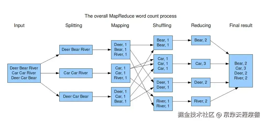 ◦Reduce阶段则负责聚合数据并生成最终结果。