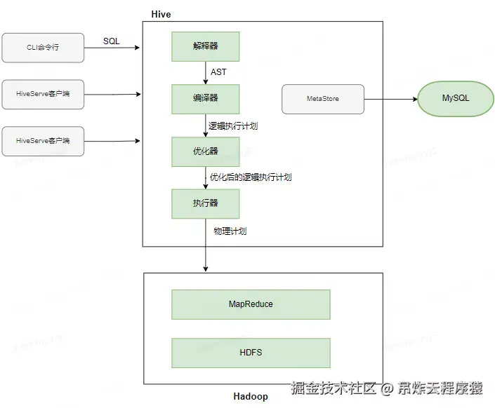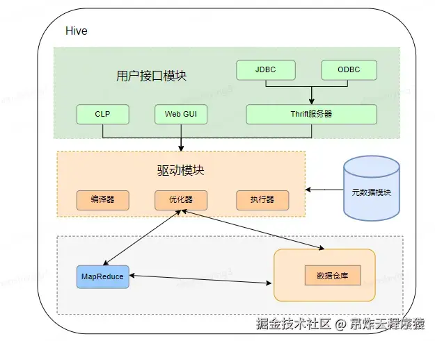 Hive是将数据文件映射成一张表,元数据模块主要负责描述和管理数据存储、表结构、分区信息等,通常存储在关系型数据库中,如MySQL或Derby。