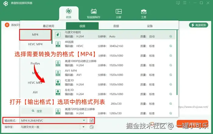 步骤2:打开【输出格式】选项中的格式列表,在该列表中选择需要转换为的格式,即【MP4】格式。
