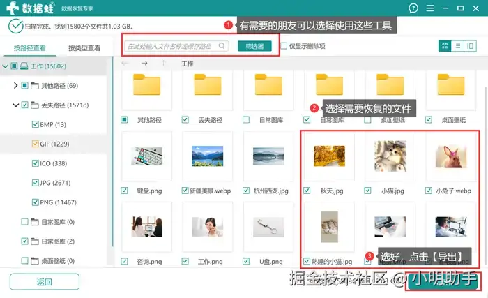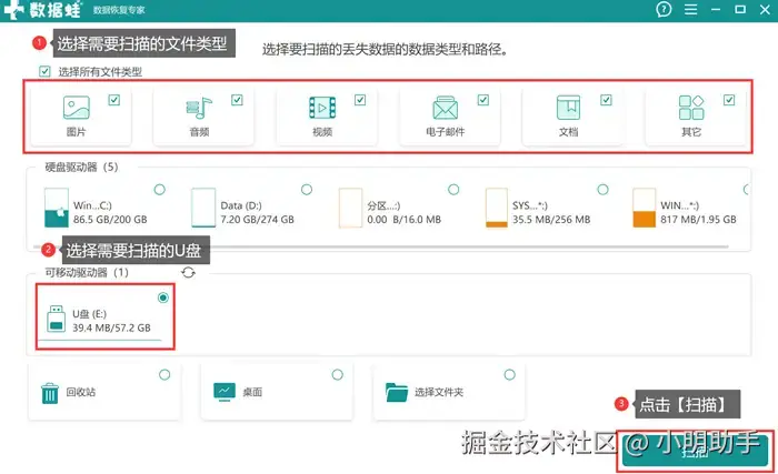 数据 蛙恢复专家,作为一款国内优秀的电脑数据恢复软件,它拥有强大且值得信赖的文件扫描恢复能力,不仅支持恢复的文件类型数量之多,而且能够让用户在扫描的文件类型上进行选择。这款软件不仅能够扫描U盘,还能扫描电脑硬盘、SD卡、电脑桌面等位置,尽可能满足大家基本的数据恢复需求。