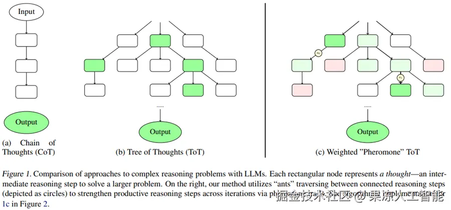 在这里,我们可以想象“蚂蚁”就是我们的 LLMs,它们在搜索高质量的思维(食物)。图从问题 x 开始,生成思维树 T(每个节点代表一个推理状态,每条边代表从一个思维到另一个思维的过渡)。