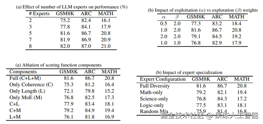 其中 C(P) 是语义一致性(通过嵌入计算两个思维的余弦相似度),L(P) 用于惩罚过长的路径(基于路径长度的负对数),M(P) 是专家模型评分(多个 LLM 的评分),w1, w2, w3 是平衡这些项的权重。
