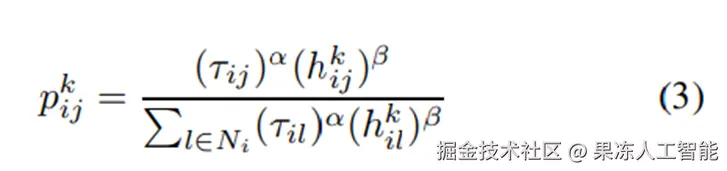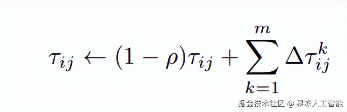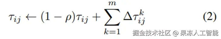 其中 ρ 是蒸发率,m 是蚂蚁的数量,Δτijk 是蚂蚁 k 添加的信息素数量。