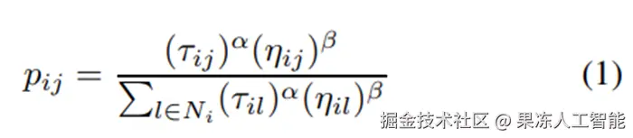 从数学上讲,这可以表示为一个图,其中蚂蚁从节点 i 选择路径 j 的概率如下: