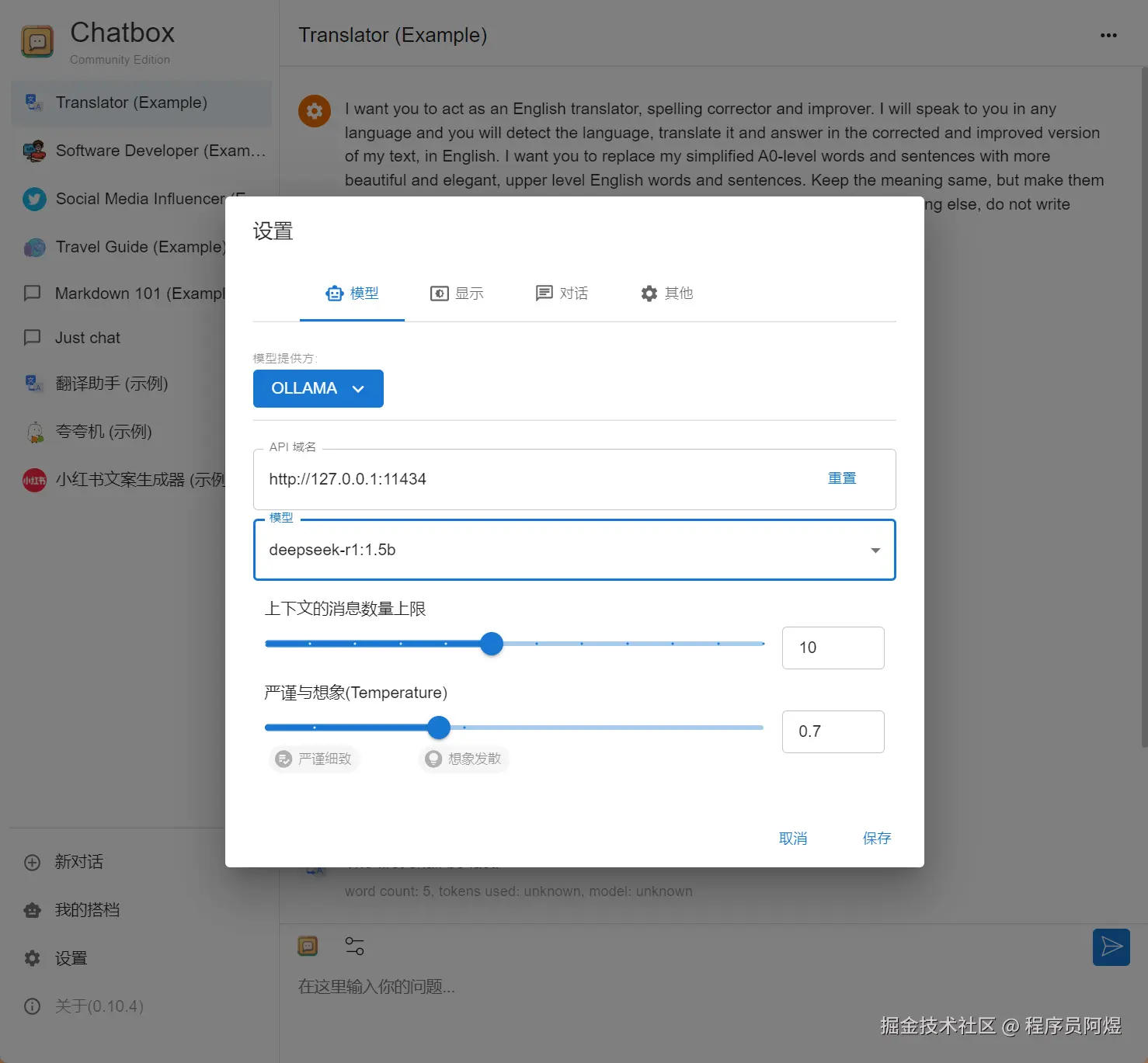 安装好chatbox客户端后,我们设置AI模型供应方为ollama并选择模型: