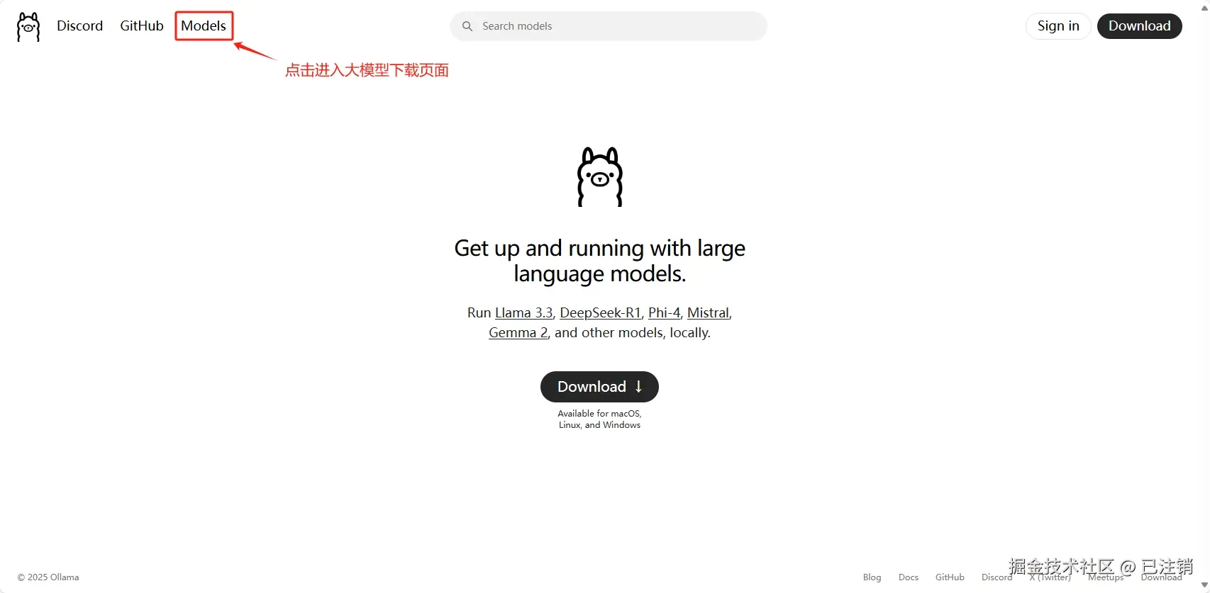 最后我们来下载大模型,再次打开 Ollama 的官网(https://ollama.com/),选择 Models 选项,如下图所示: