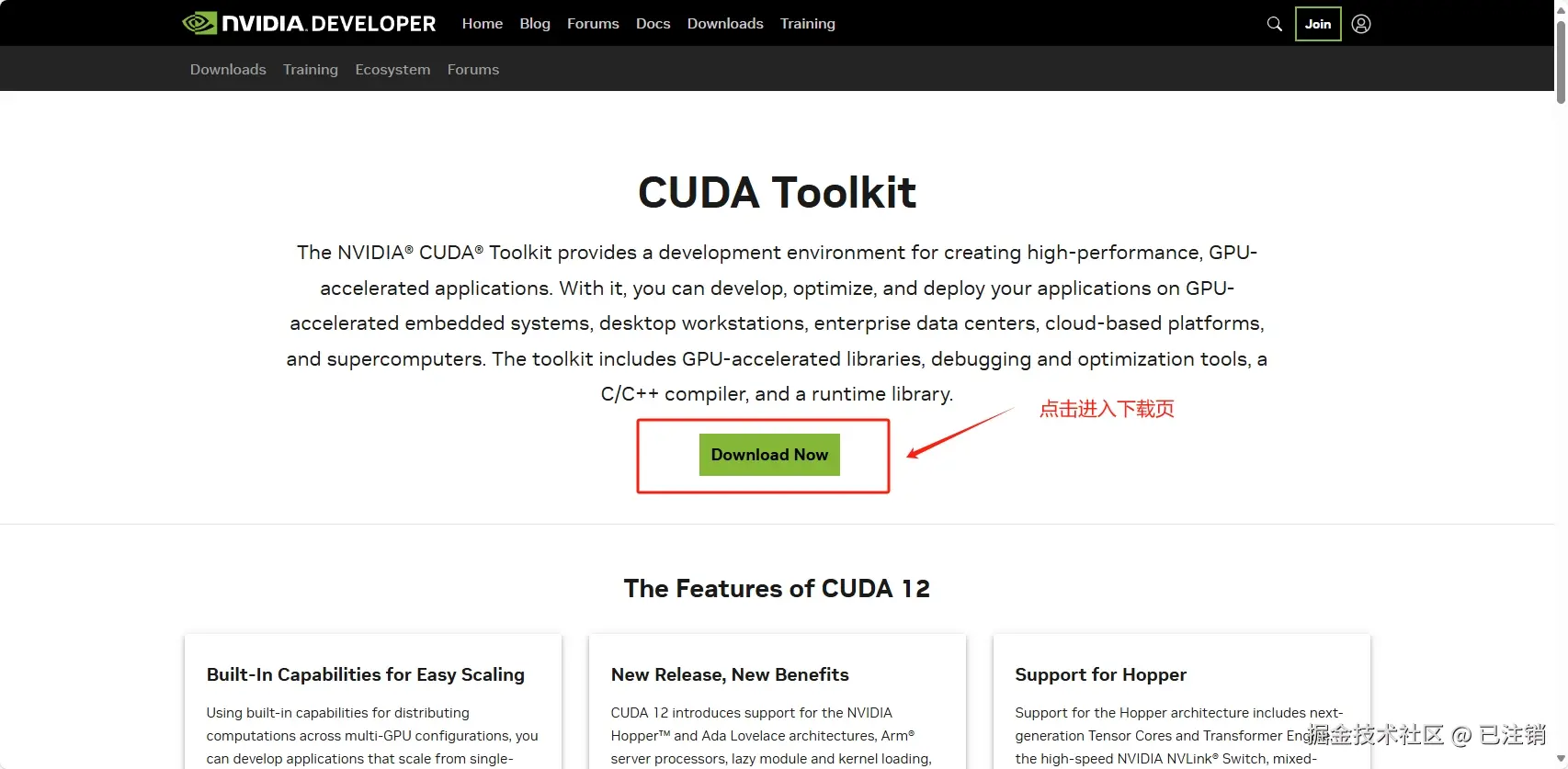 我们打开 NVIDIA CUDA Toolkit 的官网(https://developer.nvidia.com/cuda-toolkit)下载 CUDA 应用,如图所示: