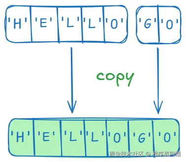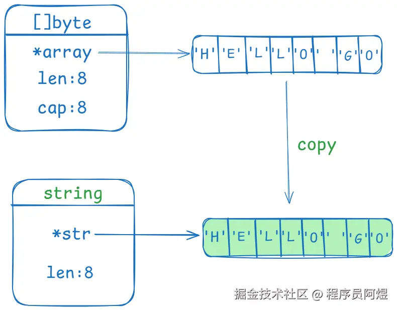 值得一提的是,这样的转换存在内存拷贝,例如从[]byte转换为string存在如下图所示的过程,反之亦然:
