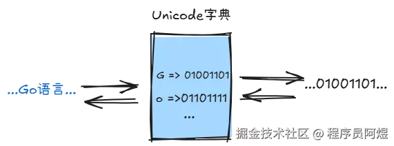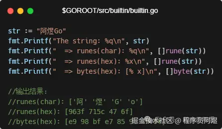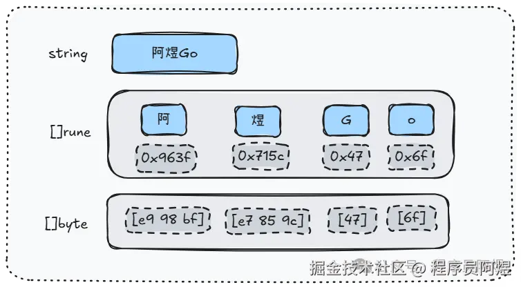 这么看有点抽象,我们来通过一个例子来理解文本字符串是如何在string类型变量中存储的。 首先定义“阿煜Go”字符串,现在我们知道该字符串底层就是一个字节数组,所以其可按照字节byte类型(1个字节)进行拆分,也可按照rune类型(4个字节)进行拆分。