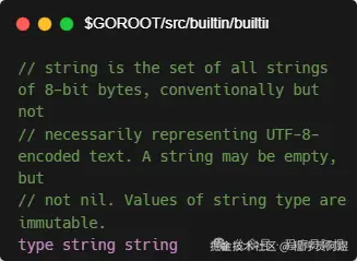 另外,也可从源码src/builtin/ builtin.go中的对string类型的描述可知,string是一个保存在字节数组中的文本字符串,一般是utf-8格式,但并不绝对。需要注意的是,string类型是不可修改的。