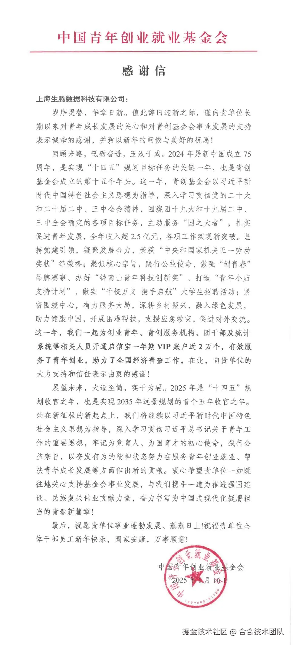 近日,中国青年创业就业基金会向启信宝发来感谢信,对其在2024年对青年创业就业和全国经济普查工作的支持表示感谢。感谢信提到,启信宝系合合信息旗下商业信息查询APP,通过大数据商查技术,为青年创业者提供了强大的信息查询和风险管理工具,助力其有效降低供应链风险,提升企业的市场竞争力。