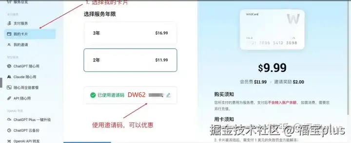 (3) 进入后台,点击左侧导航栏中的“我的卡片”。选择卡片使用期限,并扫码支付虚拟信用卡年费。2年只需要几十块,已经很便宜了。使用邀请码优惠2刀