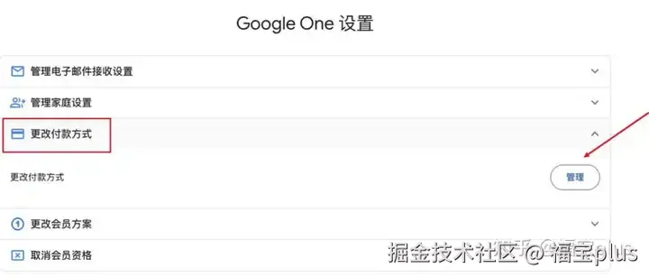 (11)在Google One上选择【更改付款方式】,点击【管理】,就会显示你的绑定信息,接着再点击订阅订阅信息的【管理】。