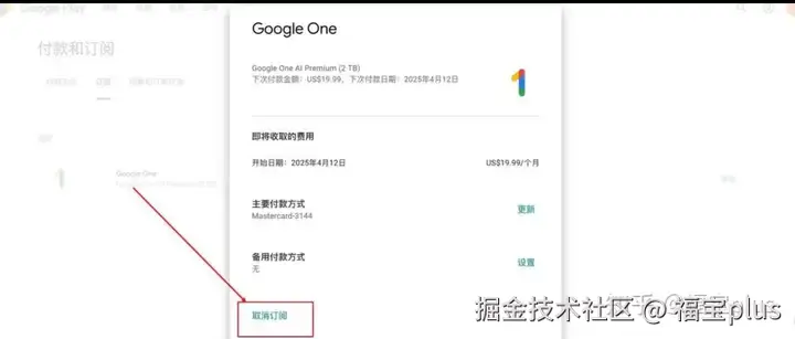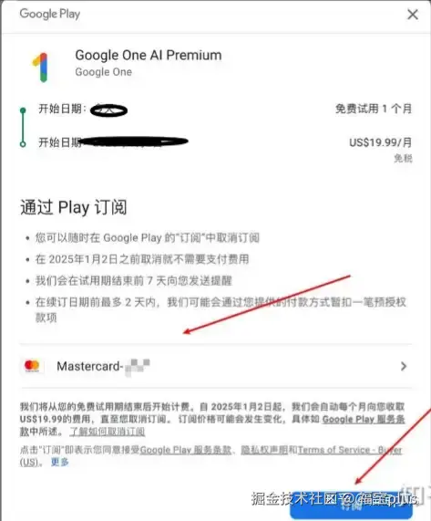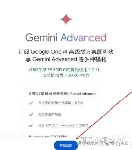 (6)接下来就是绑定到Google Gemini,进行一个订阅。订阅之后进行取消,新用户都有免费试用一个月的Gemini Pro,不过使用之前都需要你绑定支付方式。点击【开始试用】换成美元差不多20刀